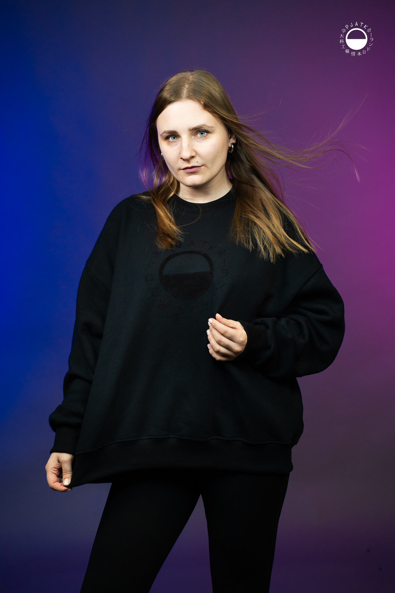 Wygodna, ciepła bluza o kroju oversize z welurowym nadrukiem logo PJATK z przodu.